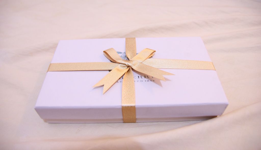 打開緞帶後紙盒上的logo是立體燙金,十分有質感。